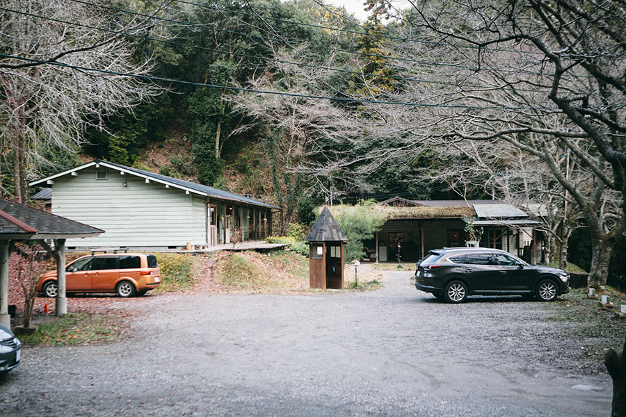 駐車場に入ると奥に見える管理棟(左)と飲食店(右)